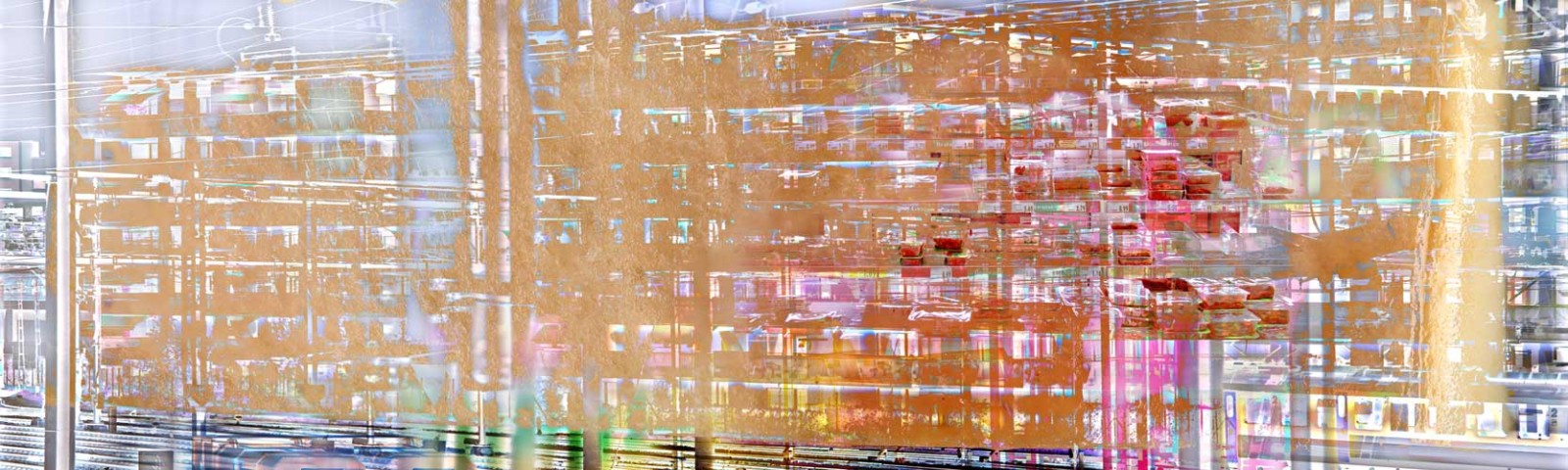Hochhäuser, Supermarktregale, Speckschwarte, Bahnhof und Flugzeug, 201208-30-01 Beschleunigte Stadt