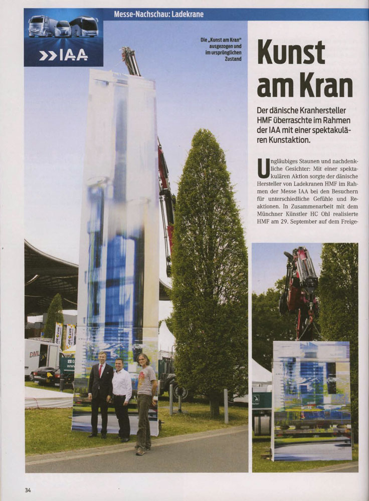 In Zusammenarbeit mit dem Münchner Künstler HC Ohl realisierte HMF am 29. September auf dem Freigelände ein einmaliges dynamisches Kunstprojekt Unter dem Titel „Kunst am Kran: Im Schatten Babylons“ wurde das großformatige Bild eines Büroturms von einem HMF-Ladekran in die Höhe gezogen und dabei scheinbar verzerrt. .Die Idee von HC Ohl und die Aussagekraft der Aktionskunst hat uns von Anfang an fasziniert, so dass wir das Vorhaben gerne unterstützt haben“, erklärt Jörg Hoffmann, Geschäftsführer der HMF Ladekrane GmbH.